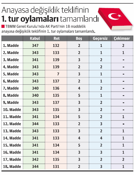 Dünya Gazetesi'nden Canan Sakarya'nın haberine göre, anayasa değişiklik teklifinin ilk tur görüşmeleri, AK Parti ve CHP arasında taktik savaşları, protestolar, eylemler, yumruklaşmalar, boğaz boğaza yaşanan kavgalarla, bir haftada geceli gündüzlü süren mesaisinin ardından tamamlandı.