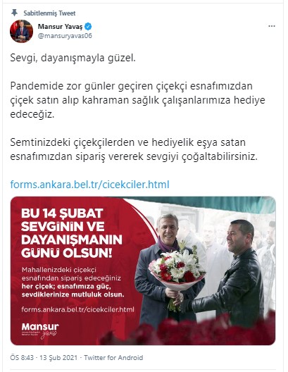 Ankara Büyükşehir Belediye Başkanı Mansur Yavaş, sosyal medya hesabından “Bu 14 Şubat sevginin ve dayanışmanın günü olsun” diyerek korona virüs salgını sürecinde zor günler geçiren çiçekçi esnafından çiçek satın alıp sağlık çalışanlarına hediye edeceklerini açıkladı.