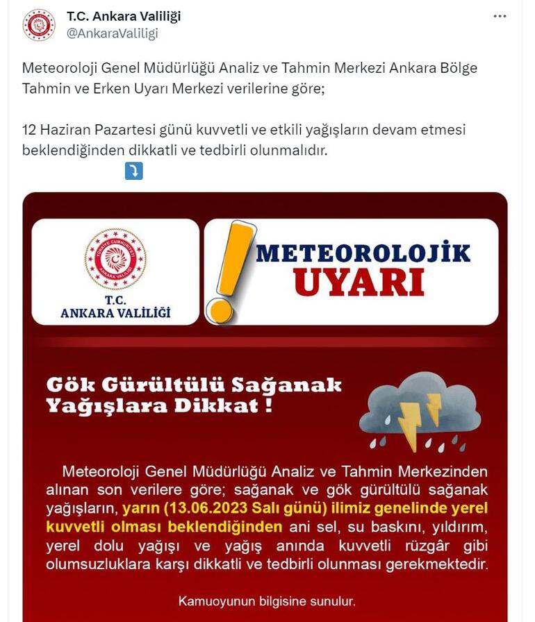 Ankara Valiliği’nin Twitter hesabından yapılan açıklamada, "Meteoroloji Genel Müdürlüğü Analiz ve Tahmin Merkezinden alınan son verilere göre; sağanak ve gök gürültülü sağanak yağışların, yarın ilimiz genelinde yerel kuvvetli olması beklendiğinden ani sel, su baskını, yıldırım, yerel dolu yağışı ve yağış anında kuvvetli rüzgar gibi olumsuzluklara karşı dikkatli ve tedbirli olunması gerekmektedir" denildi.