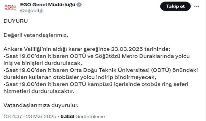 Genel Müdürlüğün sosyal medya hesabından paylaşılan açıklamaya göre, Ankara Valiliği'nin aldığı karar gereğince saat 19.00'dan itibaren ODTÜ ve Söğütözü metro duraklarında yolcu iniş ve binişleri yapılmayacak.
