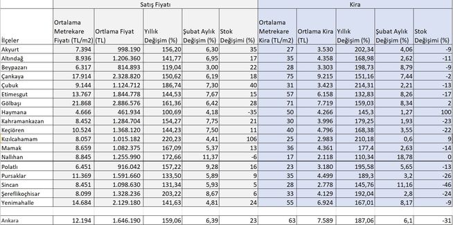 Ankara’da Şubat ayında konut kiraları %6,1, satılık konut fiyatları ise %6,39 artış gösterdi. Ankara’da ortalama kira 7 bin 589 TL, konutların ortalama satış fiyatı ise 1 milyon 646 bin 190 TL. Ankara’da konut stokunun en fazla düşüş gösterdiği ilçeler ise Sincan, Pursaklar ve Şereflikoçhisar oldu.