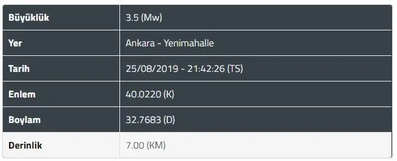 Afet ve Acil Durum Yönetimi Başkanlığının (AFAD) internet sitesinde yer alan bilgiye göre, saat 21.42'de merkez üssü Yenimahalle olan 3,5 büyüklüğünde deprem kaydedildi. Depremin yerin 7 kilometre derinliğinde olduğu belirlendi.