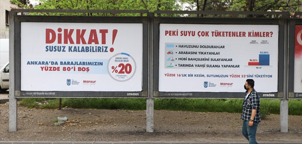 Ankara Büyükşehir Belediyesi tarafından kentin farklı noktalarındaki reklam panolarına 'Susuz kalabiliriz. Ankara'da barajlarımızın yüzde 80'i boş' uyarısı yer alan afişler asıldı. Yan yana asılan afişlerde 'Dikkat, susuz kalabiliriz', 'Ankara'da barajlarımızın yüzde 80'i boş' ve 'Ankara baraj doluluk oranı yüzde 20' yazıları yer aldı.