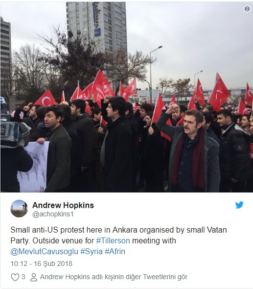 Vatan Partisi Öncü Gençlik üyeleri, "Silahlarınız, milyon dolarlarınız, vız gelir bize vız. Tillersonunuz geldi" ve İngilizce "Zeytin Dalı operasyonu emperyalist projeyi çökertiyor" yazılı pankartlar ve Türk bayraklarıyla Çavuşoğlu-Tillerson görüşmesinin yapıldığı Ankara Palas önüne geldi.