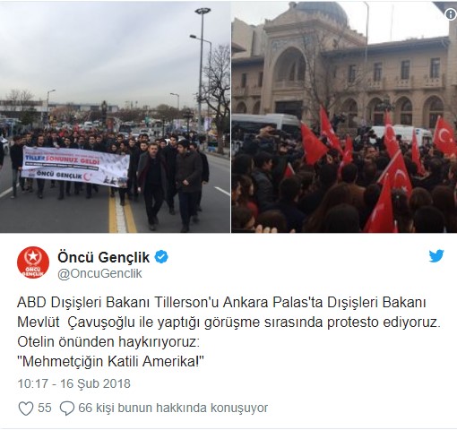 Öncü Gençlik üyeleri, burada "Katil Tillerson, Türkiye'den defol," "Katil ABD, işbirlikçi PKK," "Kahrolsun ABD emyeryalizmi," "Şehitler ölmez, vatan bölünmez," "Yankee go home" sloganları attı.