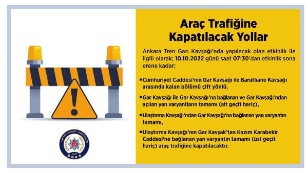 Ankara Emniyet Müdürlüğü, 10 Ekim Pazartesi günü Ankara Tren Garı Kavşağı'nda yapılacak olan etkinlik ile ilgili alınacak emniyet tedbirleri kapsamında bazı yolların 09.00-10.30 saatleri arasında trafiğe kapalı olacağını açıkladı.