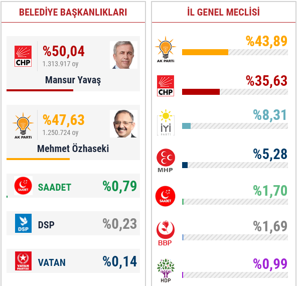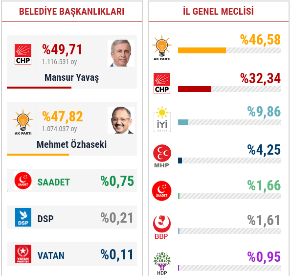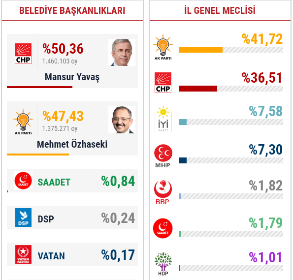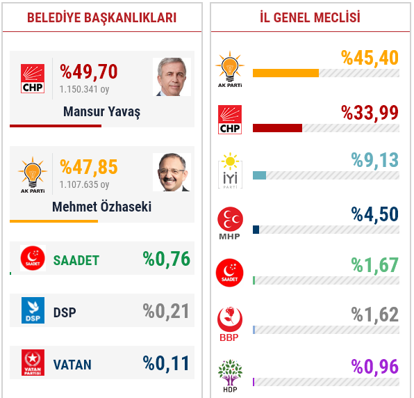 İşte Ankara'da açılan sandıklara göre Cumhur İttifakı'nın Ak Partili adayı Mehmet Özhaseki ile Millet İttifakı'nın CHP'li Büyükşehir Belediye Başkan adayı Mansur Yavaş'ın oy oranları...