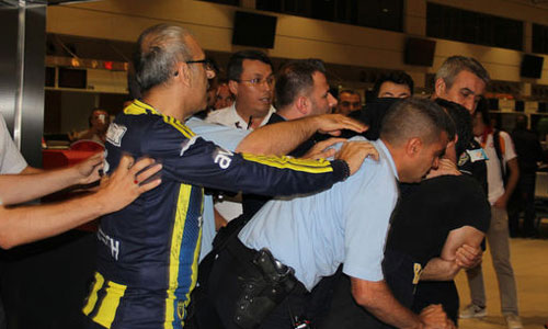 Bu sırada, güvenlik kontrolünden geçen Fenerbahçe yöneticileri ile içeride uçağa binmek için bekleyen bir grup Galatasaray taraftarı arasında arbede yaşandı. Arbede, araya giren özel güvenlik ve polis ekiplerinin müdahalesiyle büyümeden önlendi.