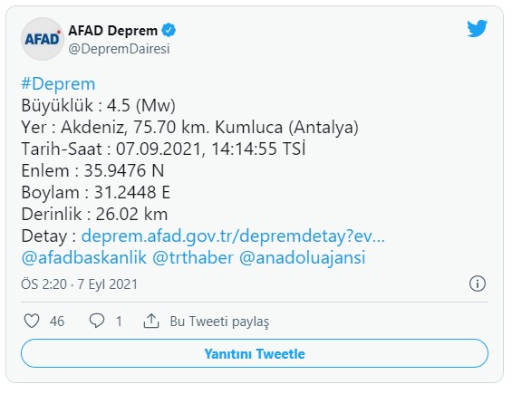 Afet ve Acil Durum Yönetimi Başkanlığının (AFAD) internet sitesinde yer alan bilgiye göre, Akdeniz'de saat 14.14'te 4,5 büyüklüğünde deprem kaydedildi.