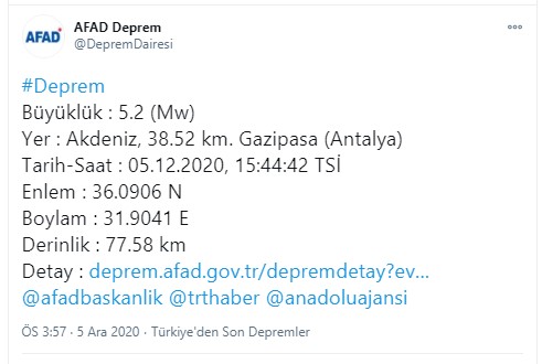 Afet ve Acil Durum Yönetimi Başkanlığı (AFAD) Deprem Dairesi'nin merkez üssünü Antalya'nın Gazipaşa ilçesinin 39.01 kilometre açığı olarak tespit ettiği Akdeniz'de 5,2 büyüklüğünde deprem saat 15.44'te meydana geldi.