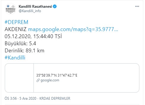 Boğaziçi Üniversitesi Kandilli Rasathanesi ve Deprem Araştırma Enstitüsü ise depremin büyüklüğünü 5,4 olarak açıkladı.