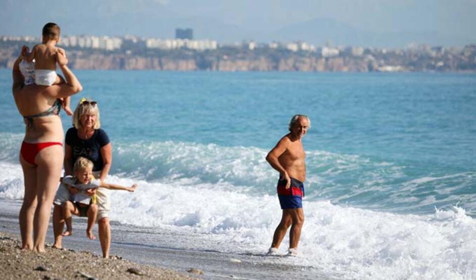 Çocuklarıyla sahile gelen yerleşik yabancılar da denizin ve pırıl pırıl Akdeniz güneşinin keyfini çıkardı.