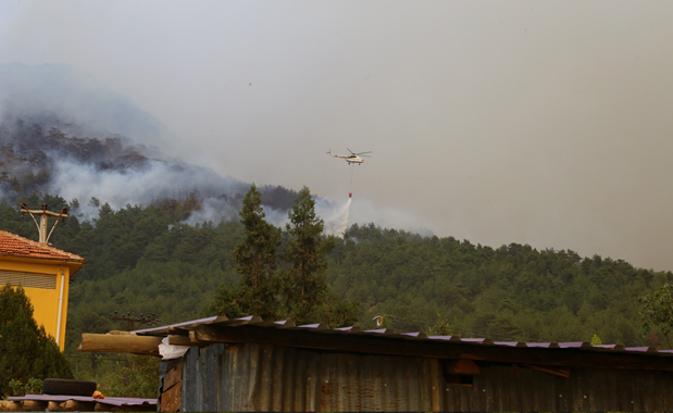 İlçe merkezine doğru ilerleyen alevlere havadan ve karadan müdahale ediliyor.