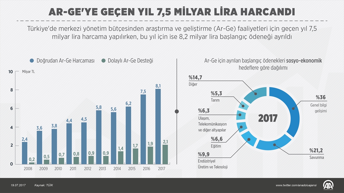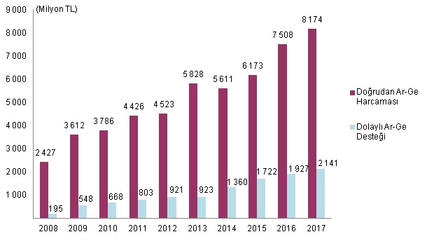 Bütçe başlangıç ödenekleri esas alınarak yapılan tahmini sonuçlara göre de 2017 yılı merkezi yönetim bütçesinden Ar-Ge için tahsis edilen başlangıç ödeneği 8 milyar 174 milyon lira oldu. Ar-Ge faaliyetlerine yönelik vergi indirim ve istisnalarının toplamı ise geçen yıl 1 milyar 927 milyon lira olarak gerçekleşti. Dolaylı Ar-Ge desteği, bu yıl için 2 milyar 141 milyon lira olarak tahmin edildi.