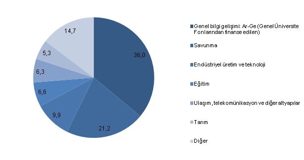 Merkezi yönetim bütçesinden Ar-Ge için ayrılan başlangıç ödenekleri sosyo-ekonomik hedeflere göre sınıflandırıldığında, 2017 yılı için en fazla ödeneğin yüzde 36 ile genel bilgi gelişimi (genel üniversite fonlarından finanse edilen) için tahsis edildiği görüldü. Bunu yüzde 21,2 ile savunma, yüzde 9,9 ile endüstriyel üretim ve teknoloji, yüzde 6,6 ile eğitim, yüzde 6,3 ile ulaşım, telekomünikasyon ve diğer altyapılar ve yüzde 5,3 ile tarım takip etti.