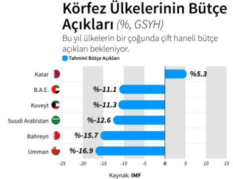 2019 yılında Körfez ülkelerinin bütçe açığının milli gelire oranı yüzde 5 iken bu yıl rakamın 2020'de yüzde 18'e çıkması bekleniyor.