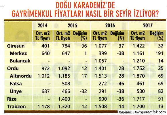 Örneğin Giresun merkezde 2014 yılında 640 TL olan gayrimenkul m2 fiyatları 2017 yılında bin 161 TL seviyelerine çıktı, il genelinde ise ortalama m2 fiyatları 2014'te 401 TL İken 2017 yılında bin 422 TL'ye ulaştı.