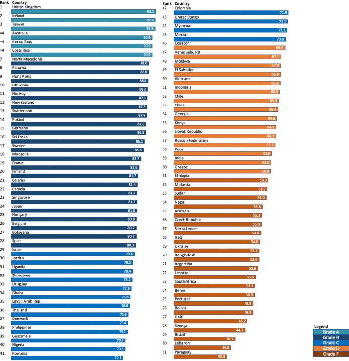 Norveç, İsveç, İsviçre, Finlandiya ve Fransa gibi gelişmişlik seviyesi yüksek ülkeler ise B notu alarak 7. ila 28. olan ülkelerin bulunduğu "ikinci seviye"de yer bulabildi. ABD ise 81 ülke arasında 43. sırada yer alarak C notu aldı. ABD'ye Kolombiya, Myanmar, Meksika, İsrail ve Nijerya gibi ülkeler eşlik etti. D notu verilen ülkeler arasında ise Venezuela, Çin, Moldova, Kenya, Rusya, Hindistan ve Yunanistan gibi ülkeler göze çarptı.