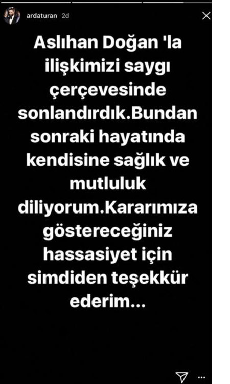 Arda Turan, Instagram hesabından 'Aslıhan Doğan'la ilişkimizi saygı çerçevesinde sonlandırdık. Bundan sonraki hayatında kendisine sağlık ve mutluluk diliyorum. Kararımıza göstereceğiniz hassasiyet için şimdiden teşekkür ederim...' mesajını paylaştı.