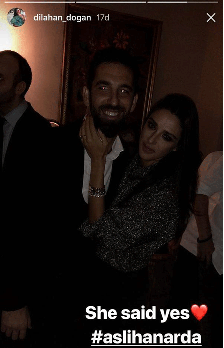 Sosyal medyada paylaşılan videoda, Arda Turan elinde yüzük ile görünüyor. Aslıhan Doğan'a evlilik teklifinde bulunan Arda, "Hayatımın en güzel parçası olan Aslıhan, Benimle evlenir misin?" diye sordu. 'Evet' kararını alan Arda Turan büyük bir sevinç yaşadı.