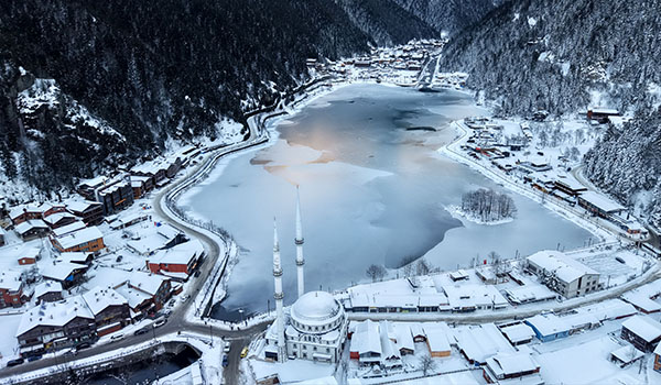 Çaykara ilçesine 20 kilometre uzaklıkta, denizden bin 250 metre yükseklikte yer alan, doğal güzelliğiyle Doğu Karadeniz'in turizm merkezi Uzungöl, yağan karla beyaz örtüyle kaplandı. Yağışın ardından bölgede seyirlik manzara oluştu. Otantik mimarisi, dik yamaçları ve orman örtüsünün bir arada bulunduğu Uzungöl'de kar kalınlığı, yer yer 40 santimetreye ulaştı. Bölgede özellikle gece saatlerinde hava sıcaklığının sıfır derecenin altına düşmesiyle göl yüzeyinin büyük kısmı buz tuttu. Doğayla iç içe sakin gün geçirmek için Uzungöl'e gelen ziyaretçiler, yüzeyi buz tutan gölün etrafında yürüyüş yaparak manzarayı izledi. Uzungöl'de manzara dronla kaydedildi.