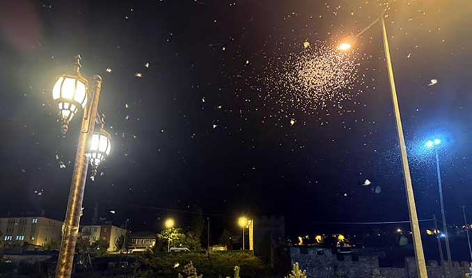 Geçen yıla oranla bir hafta önceden görünmeye başlanan ve Ardahan Kalesi bölgesinde akşam saatlerinde toplanan çok sayıdaki sinek, aydınlatma lambalarının etrafını sardı.