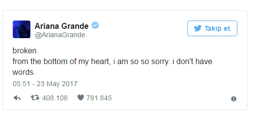 Pop sanatçısı Ariana Grande'nin konseri sırasında meydana gelen patlama sonrasında panik yaşandığı belirtilirken, şarkıcı büyük bir şok yaşadı. Twitter'dan da üzüntüsünü belirten şarkıcı "Kalbim derinden kırıldı, çok üzgünüm, söyleyecek söz yok" dedi.