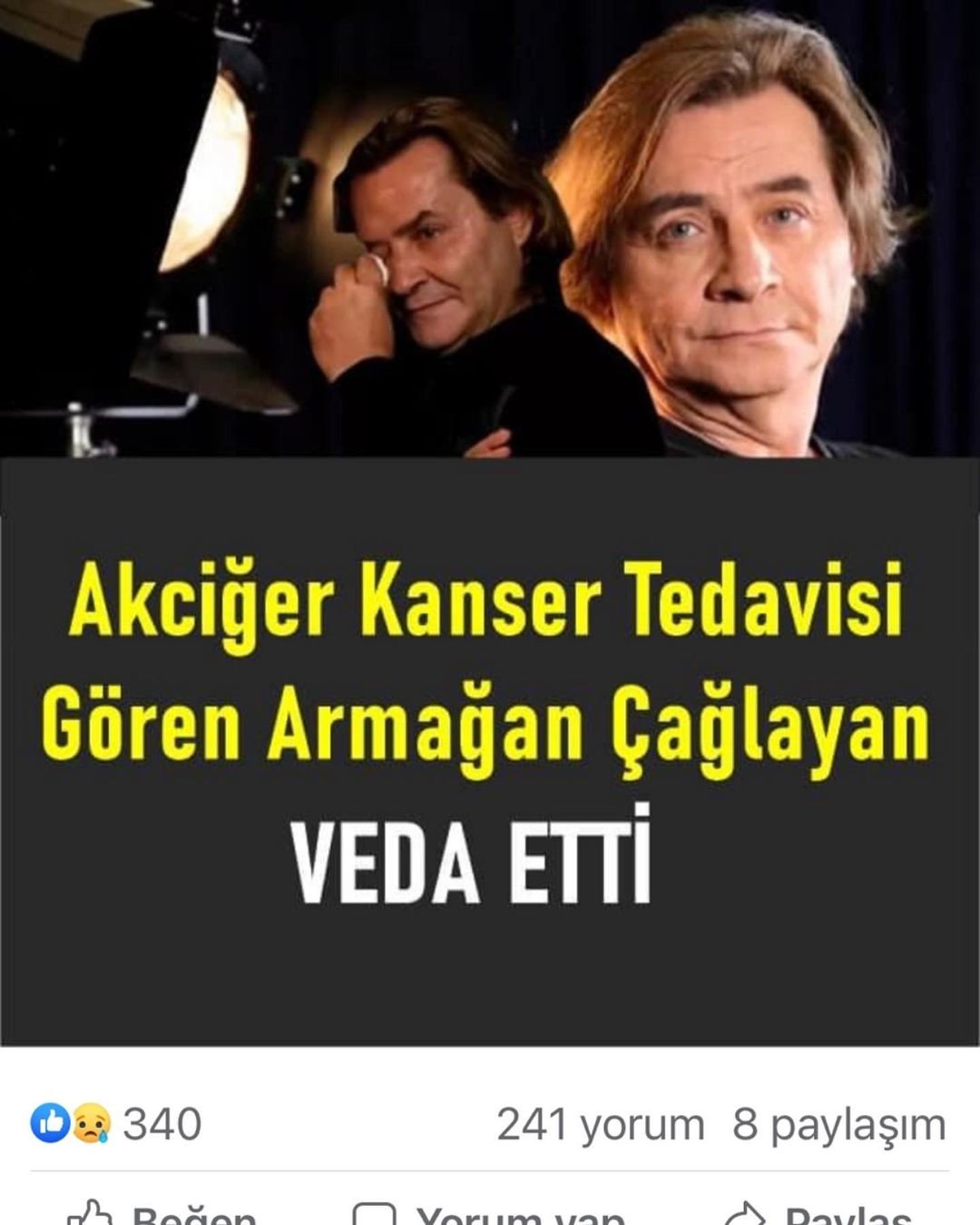 Akciğer kanseriyle mücadele eden Armağan Çağlayan hakkında yapılan ölüm haberlerine isyan etti. Twitter hesabından konuyla ilgili rahatsızlığını dile getiren Çağlayan, “Ya bu Facebook’ta dolanan ‘Armağan Çağlayan öldü’ haberini nasıl kaldırtacağız? Telefonlar kilit! Herkes ağlayarak arıyor! Tövbe yahu!” ifadelerini kullandı.