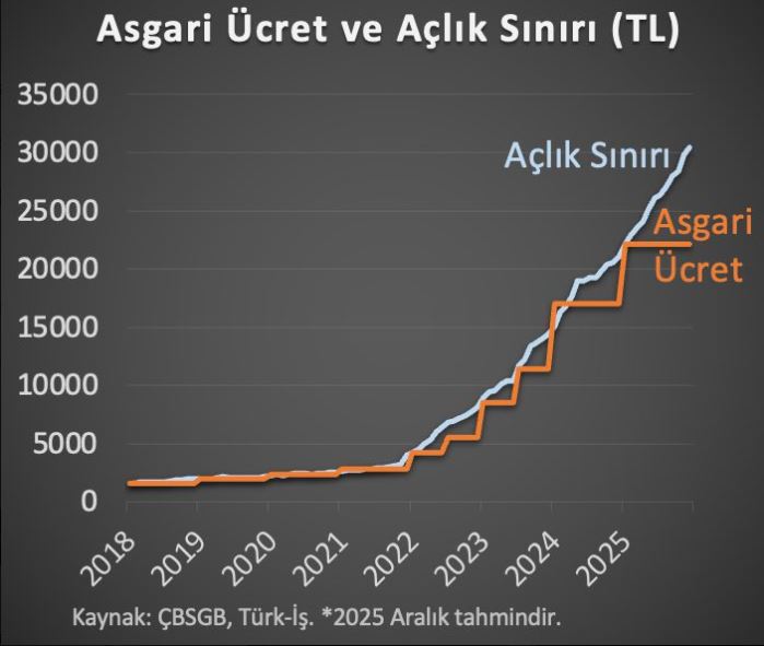 2025 yılına girerken yüzde 30 oranında zamlanarak 22.104 TL’ye çıkan asgari ücret, yılın ilk ayından bu yana Türk-İş’in açlık sınırı altından kaldı.