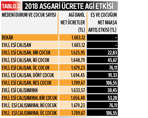 Evli ve çocuklularda AGİ daha yüksek olduğundan net ele geçen maaş 1.603 liranın da üzerine çıkıyor. Eş ve çocukların AGİ yoluyla net maaşta sağladığı artışlar Tablo 2’de yer almakta.