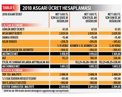 2018’de asgari ücret aylık (brüt) 2.029,50 lira olarak uygulanacak. Brüt ücretten yasal kesintiler düşülünce, net ücret 1.450,91 lira oluyor. Üzerine 152,21 lira Asgari Geçim İndirimi (AGİ- Bekâr için) eklenince, asgari ücretli çalışanın net maaşı 1.603,12 lira (Tablo 1) yapıyor...