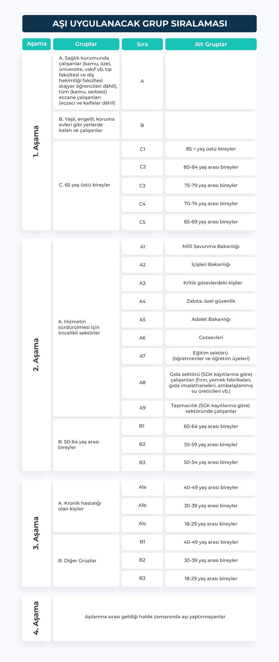 Sağlık Bakanlğı, aşı uygulanacak meslek grupları netleşti. Aşı uygulanacak grup sıralaması tablosu Covid19asi.saglik.gov.tr adresinden paylaşıldı. Buna göre 1. aşamada Sağlık Kurumunda Çalışanlar, Yaşlı, engelli, koruma evleri gibi yerlerde kalanlar ve çalışanlar ve 65 yaş üstü bireyler aşılanacak. İkinci aşamada ise hizmetin sürdürülmesi için öncelikli olan sektörler ve 50-64 yaş arası bireyler aşı olacak. Üçüncü aşamada ilk olarak kronik rahatsızlığı olan kişiler yaş gruplarına göre sıralanarak aşılanacak ve geriye kalan grupların aşılanmasıyla üçüncü aşama tamamlanacak.