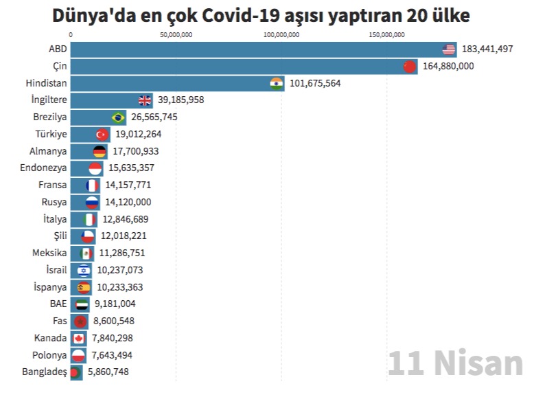 Türkiye'de 11 Nisan 2021 itibariyle 18,45 milyon kişiye korona virüs aşısı yapıldı. Rakam bazda Türkiye, ABD, Çin, Hindistan, İngiltere ve Brezilya'dan sonra en çok aşı yapan 6'ıncı ülke konumunda yer alıyor.