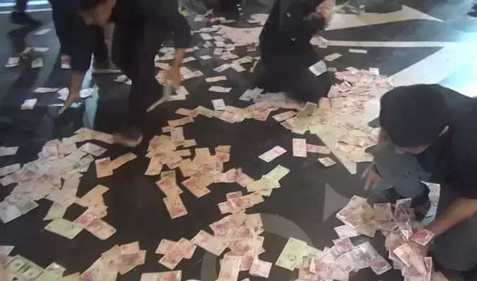 Deste deste dolarların ve Türk lirasının havada uçuştuğu düğünde, orkestranın görevlendirdiği 10 kişi ise yere atılan paraları toplayarak çantalara koydu.