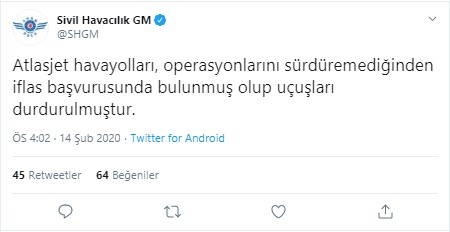 Sivil Havacılık Genel Müdürlüğü (SHGM) Twitter'dan yaptığı açıklama şirketin iflas başvurusunda bulunduğunu ve operasyonlarının durdurulduğunu bildirdi.