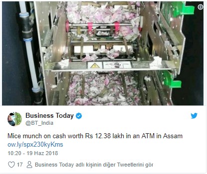 Hindistan'da bulunan Assam'ın Tinsukia bölgesinde bir ATM'nin çalışmadığı yönünde yapılan bildirimin ardından, ATM'nin içerisinde bulunan toplamda 12.38 lakh (yaklaşık 9 milyon TL) paranın fareler tarafından yenildiği öğrenildi.ATM'deki banknotların üzerindeyse fare ölüleri bulundu.