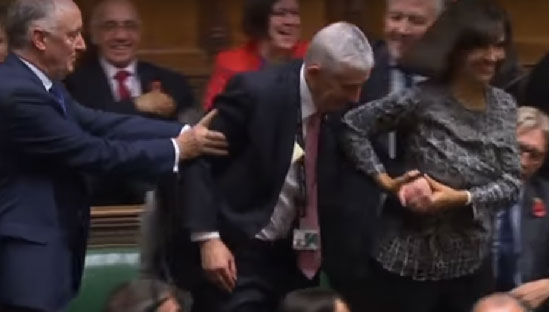 Hoyle'u, milletvekilleri, parlamentonun geleneğine uygun olarak sürükleyerek kürsüsüne çıkardı.