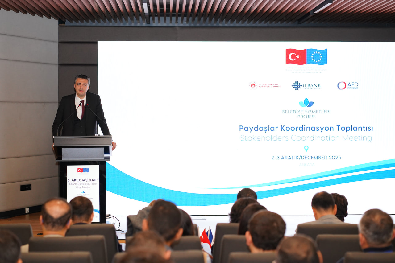 Belediye Hizmetleri Projesi’nin nihai faydalanıcıları olan, Adıyaman, Gaziantep, Hatay, Kilis, Malatya, Mardin, Mersin ve Şanlıurfa olmak üzere 8 ildeki 13 yerel idare, 2-3 Aralık 2025 tarihinde Ankara’da düzenlenen bir çalıştayda buluşup uygulama esnasında edindikleri deneyimlerini paylaştılar. Açılışını İLBANK Uluslararası İlişkiler Grup Başkanı Şevket Altuğ Taşdemir, Avrupa Birliği Türkiye Delegasyonu COOP 2 Takım Lideri Sergey Mihaylov, AFD Türkiye Direktörü Xavier Muron ve Avrupa Birliği Türkiye Delegasyonu FRIT Altyapılar Program Müdürü Vidmantas Ruplys’in yaptığı çalıştayda, uluslararası ihale süreçleri, çevresel ve sosyal risklerin yönetimi, iş sağlığı ve güvenliği, sözleşme yönetimi gibi teknik konular ele alındı. Çalıştaya belediyeler ile su ve kanalizasyon idarelerinin yanı sıra, İLBANK Proje Yönetim Birimi ve Bölge Müdürlükleri de katılarak, projenin koordinasyon süreciyle ilgili bilgilendirme yaptı.