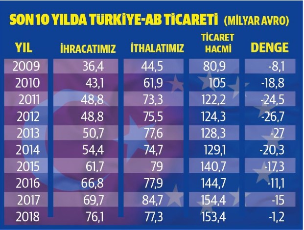 Gümrük Birliği mutabakatının getirdiği dezavantajlara rağmen Türkiye, Avrupa Birliği ile ticaretinde dengeyi sağlamaya yakın. Türkiye’nin Avrupa Birliği (AB) ile ticaret açığı 2017 yılındaki 15 milyar Euro seviyesinden 2018 yılında 1,2 milyar Euro'ya geriledi. Avrupa İstatistik Ofisi (Eurostat), AB ve Euro Bölgesinin 2018 yılı uluslararası ticaret verilerine göre; Türkiye’nin AB’den ithalatı 2017 yılında 84,8 milyar Euro'dan 2018 yılında 77,2 milyar Euroya düştü. Türkiye’nin AB’ye ihracatı ise 2017 yılındaki 69,8 milyar Euro seviyesinden 2018’de 76,1 milyar Euro'ya yükseldi.
