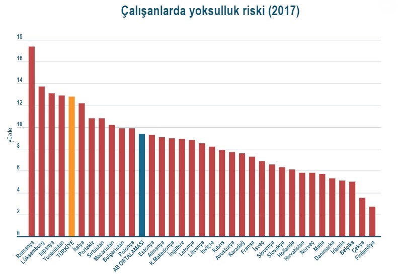 Avrupa Birliği (AB) ülkelerinde 10 çalışandan biri yoksulluk riski altında. 2017 yılında çalışanlarda yoksulluk riski oranı AB ülkelerinde yüzde 9,4 iken Türkiye’de yüzde 12,8 oldu. Çalışanlarda yoksulluk riskinde Romanya, Lüksemburg, İspanya ve Yunanistan, Türkiye’nin üzerinde yer aldı.