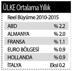Tablodan hemen farkına varmamız gereken şey de ABD ve Almanya’nın krizi oldukça atlattığı. Unutmayalım, tablo 2010-2015 arasının ortalama büyümesini sergiliyor. 2016 yılı henüz yok. Ama ABD ve Almanya yüzde 2 büyüme civarındalar. Almanya’nın 2016 büyümesi de yüzde 1.9 olarak tahmin ediliyor. Almanya 2016 büyümesi bugünlerde “resmen” ilan edilecek.