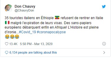 İtalyan turistlerin, ülkelerine geri dönmek istemeyip, Etiyopya kalmak istemeleri ise sosyal medyada geniş yankı uyandırdı. Sosyal medyayı kullananlar, birkaç ay öncesine kadar Afrikalıların İtalya’ya gitmek için can atarken şimdi İtalyanların bu ülkede kalma istemini büyük bir ironi olarak değerlendiriyor.