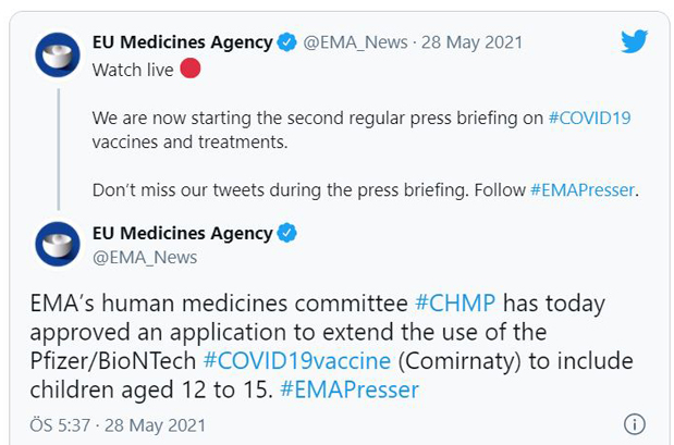EMA'dan yapılan açıklamada, "EMA’nın İnsan İlaçları Komitesi bugün, Pfizer / BioNTech Kovid-19 aşısının (Comirnaty) 12 ila 15 yaş arasındaki çocukları kapsayacak şekilde genişletilmesine yönelik başvuruyu onayladı" ifadeleri yer aldı.