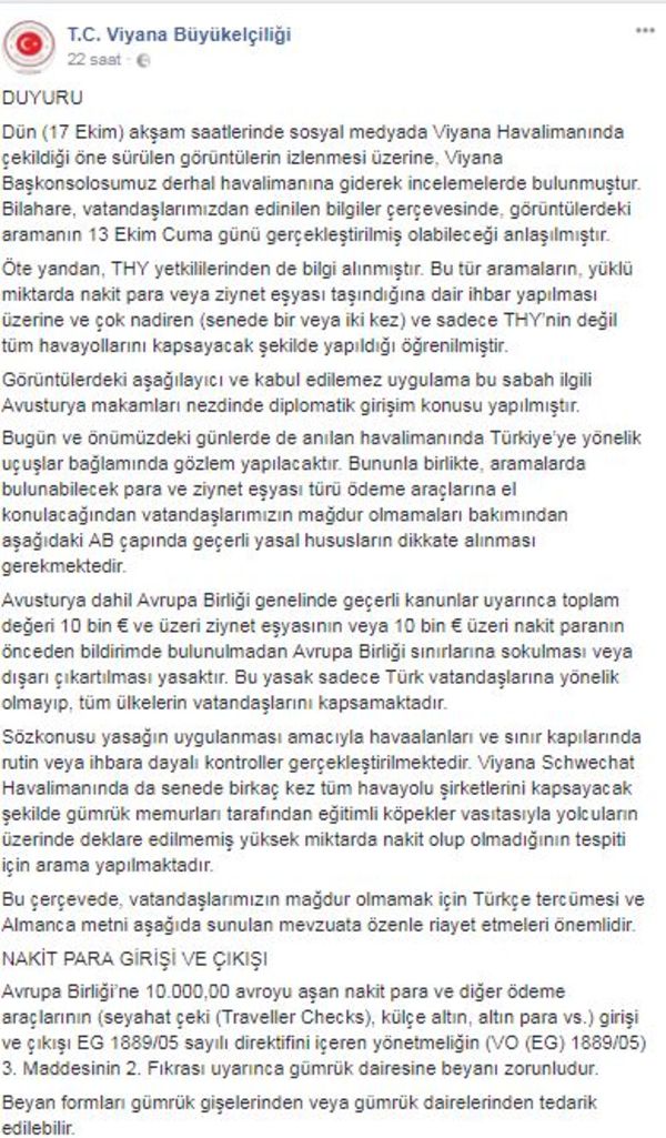 "Dün (17 Ekim) akşam saatlerinde sosyal medyada Viyana Havalimanında çekildiği öne sürülen görüntülerin izlenmesi üzerine, Viyana Başkonsolosumuz derhal havalimanına giderek incelemelerde bulunmuştur. Bilahare, vatandaşlarımızdan edinilen bilgiler çerçevesinde, görüntülerdeki aramanın 13 Ekim Cuma günü gerçekleştirilmiş olabileceği anlaşılmıştır.