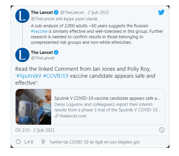 İngiliz saygın tıp dergisi The Lancet, 2 Şubat’ta Sputnik V’nin ciddi yan etkilerin görülmediğini ve yıllarca sürebilecek istikrarlı bir bağışıklık oluşturduğunu gösteren klinik çalışmalarının üçüncü aşamasının ara sonuçlarını yayınlamıştı. 20 binden fazla gönüllüden elde edilen verilere dayanan Lancet makalesinde Sputnik V aşısının yüzde 91.6 düzeyinde etkinliği olduğu da doğrulandı.