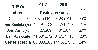 2018 yılının Ocak – Temmuz döneminde; Türkiye’den Rusya’ya yapılan deri ürünleri ihracatı, 2017 yılının aynı dönemine göre yüzde 64’lük artışla 88 milyon 39 bin dolardan, 144 milyon 575 bin dolara çıkarken, ayakkabı ihracatı 91 milyon 707 bin dolarlık tutarla aslan payını aldı. 2018 yılında Türkiye’nin Rusya’ya ayakkabı ihracatı yüzde 120 artış gösterdi.