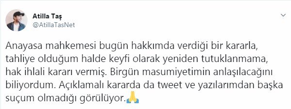 Söz konusu kararı Twitter hesabından duyuran Taş, “Anayasa mahkemesi bugün hakkımda verdiği bir kararla, tahliye olduğum halde keyfi olarak yeniden tutuklanmama, hak ihlali kararı vermiş. Bir gün masumiyetimin anlaşılacağını biliyordum. Açıklamalı kararda da tweet ve yazılarımdan başka suçum olmadığı görülüyor” dedi.