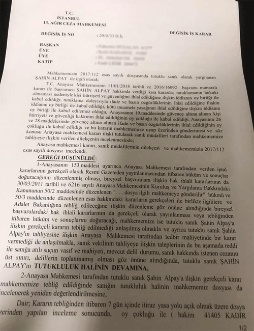 Anayasa Mahkemesi Genel Kurulu, kapatılan Zaman gazetesi eski yazarlarından Alpay ve gazeteci-yazar Altan ile Cumhuriyet Gazetesi Kitap Eki Yayın Yönetmeni Turhan Günay'ın bireysel başvurularını görüşmüş, 6'ya karşı 11 üyenin oy çokluğuyla başvurucularla ilgili ihlal kararı vermişti.