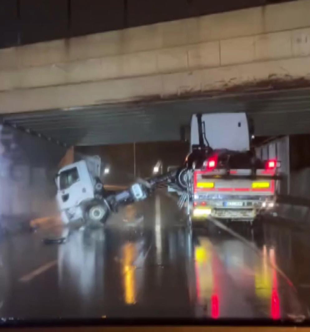 İstanbul'un Bakırköy ilçesinde, daha önce de kazaların yaşandığı üst geçide, üzerinde kamyon bulunan TIR çarptı. Kaza anı ise cep telefonu görüntüsüne yansıdı.