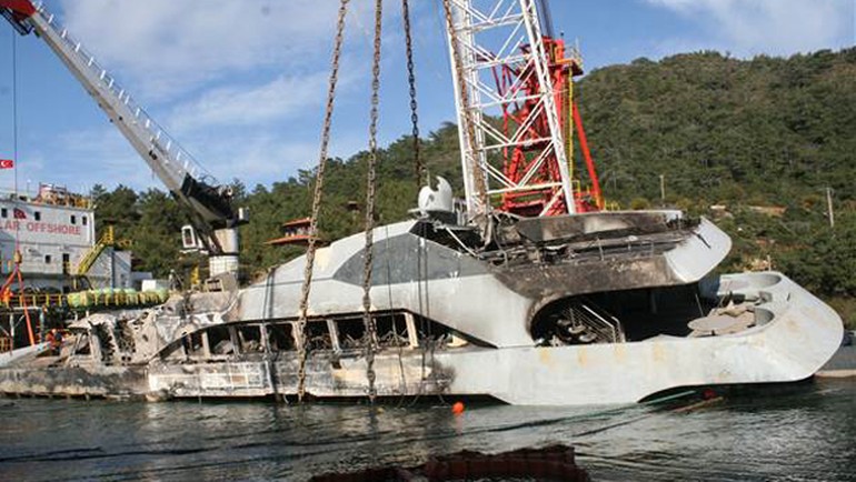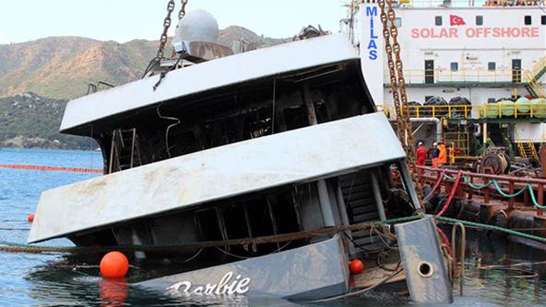 Yatın, boşaltılan tankları ile kapalı bölümlerine hava basılarak vinç yardımıyla deniz üstüne çıkartıldığını belirten Bora, bu işlem için daha önce testler yapıldığını, ayrıca denizin kirletilmemesi için de tedbirler alındığını söyledi.